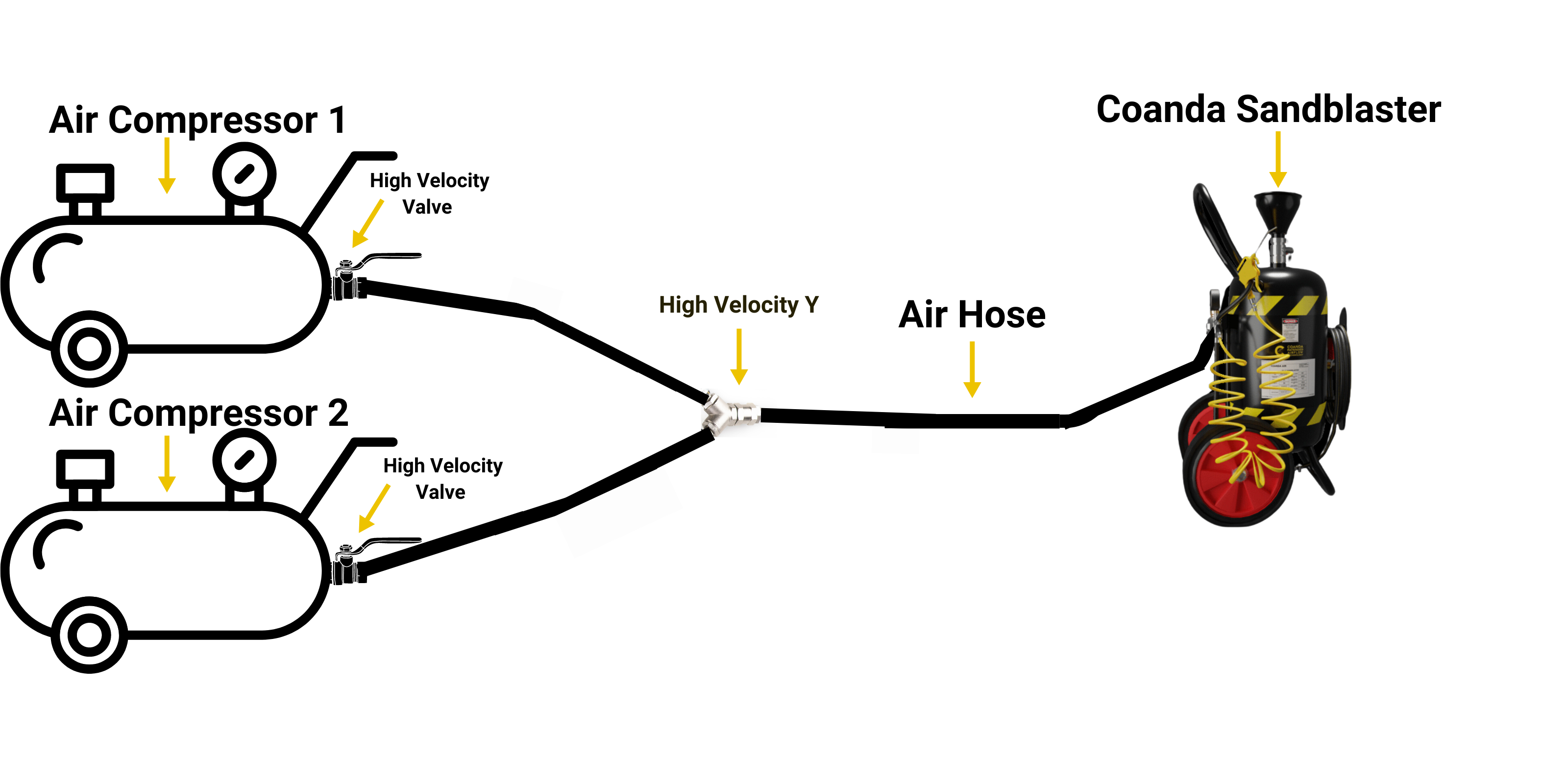 - Parallel Power: Connect two air compressors in parallel with the Coanda High Velocity Y, combining their power for maximum efficiency.